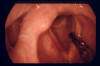 Lupenendoskopischer Blick in eine eingeengte Luftröhre (Säbelscheidentrachea) nach Operation eines Schilddrüsenkarzinoms mit Bestrahlung |