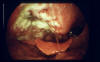 Blick in den Kehlkopf bei Pseudokrupp. Deutlich erkennbar die entzündliche geschwollenen subglottischen Anteile der Stimmlippen bds. |